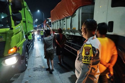 Polisi memantau jam operasional truk tambang di Tangerang (Foto: Antara/Achmad Irfan)